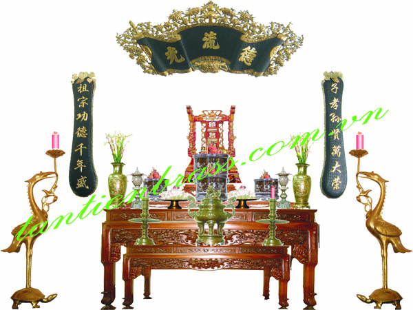 Phía sau bát hương: Bày bộ bình cắm hoa, ống cắm hương, chân nến, lư đồng, đèn thờ...