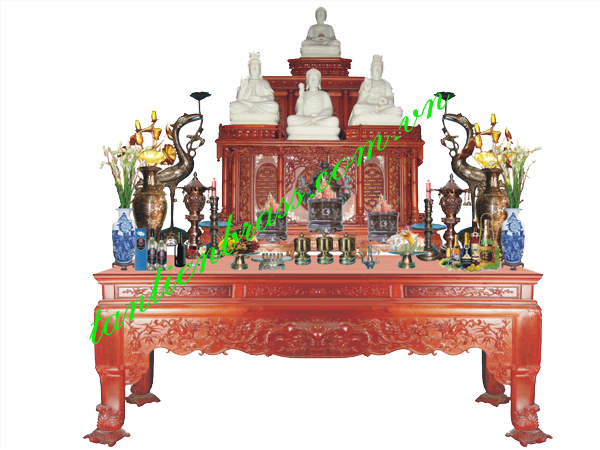 Phía trước bát hương: Ở giũa bày bộ đài nhỏ với 3 chén đựng nước sạch. Hai bên là hai đĩa mâm bồng đựng hoa quả, trầu cau hoặc tiền vàng.